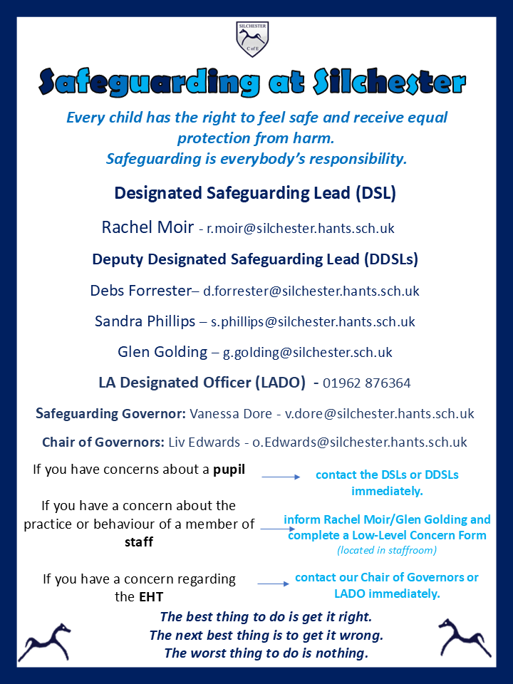 If you have any serious concerns about your child or any other pupil at Silchester CE Primary, please do not hesitate to contact the Designated Safeguarding Lead, who knows who to contact for the best advice and help and is experienced in using the appropriate degree of confidentiality.