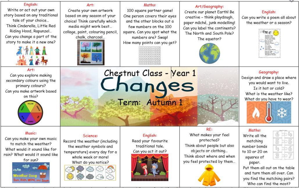 The image below is an example of the Home Learning Grids and using the blue tabs below, you can download grids for the whole school each term.