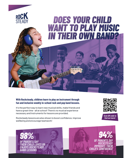 • Rocksteady Lessons – children form their own rock band and perform to the school.