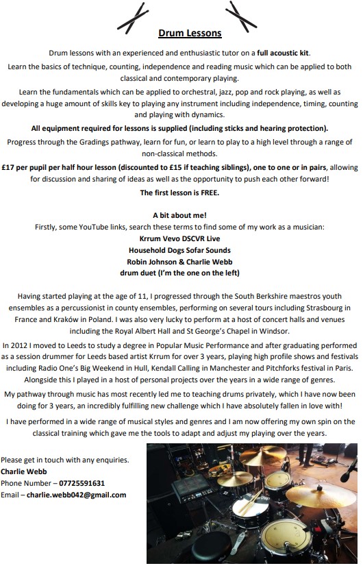 • Music – individual instrument tuition via the Hampshire Music Service (guitar, brass, keyboards, flute) or via our visiting drum teacher Charlie Webb.