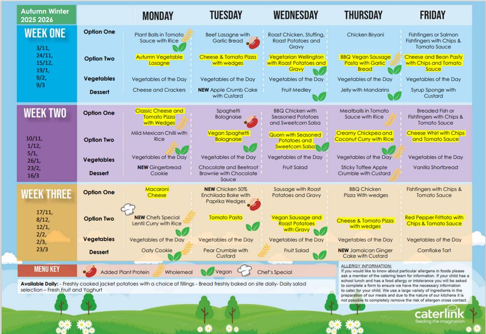All of our school meals are cooked on site and children can choose their lunch options in the morning.